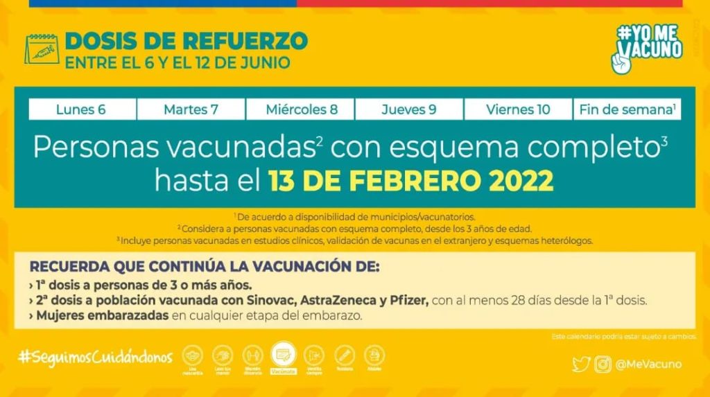 Dosis de Refuerzo : Semana entre el 6 y 10 de junio(Corresponde 3ª Dosis), personas vacunadas con esquema completo ( Dos Dosis) hasta el 13 de Febrero 2022.