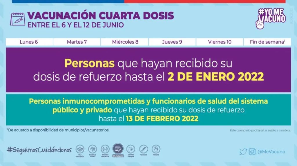4ª Dosis : Semana del 06 al 10 de Junio personas que hayan recibido su dosis de refuerzo (3ª dosis) hasta el 2 de enero 2022.