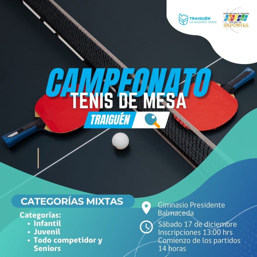 Imperdible próximo sábado 17 de diciembre primer torneo de Tenis de Mesa en nuestra comuna a efectuarse en el Gimnasio Presidente Balmaceda(Av.Suiza) desde las 13:00 hrs.
