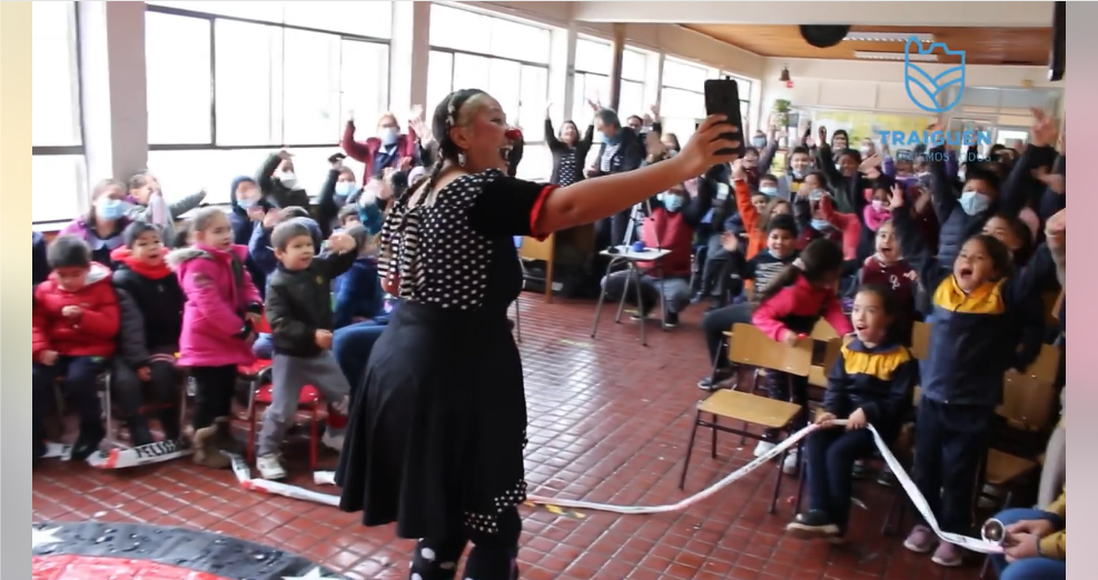 Durante la mañana de este jueves los niños y niñas de nuestra escuela tuvieron un bello momento quienes recibieron la visita de «Monga», payasita del Circo Patudo, en el marco de la ejecución del proyecto «Otoño Escénico Araucanía». para llevarles un hermoso espectáculo de alegría y de risas para los pequeños de la Escuela Diego Portales.