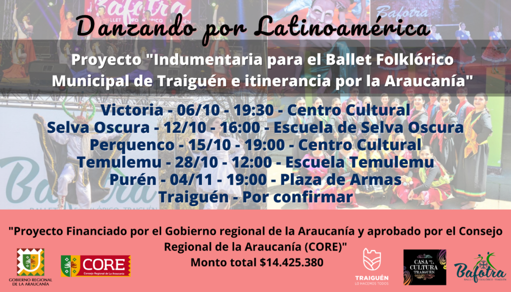 Estas presentaciones se realizan en el marco de la ejecución del proyecto «Indumentaria para el Ballet Folklórico Municipal de Traiguén e itinerancia por la Araucanía», Financiado por el Gobierno Regional de la Araucanía y Aprobado por el Consejo Regional de la Araucanía (CORE), por un monto total de $14.425.380.