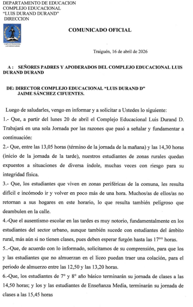 Mediante un comunicado oficial dirigido a padres y apoderados, el Complejo Educacional Complejo Educacional Luis Durand Durand informó que, a contar del lunes 20 de abril, el establecimiento comenzará a funcionar bajo un sistema de jornada única.