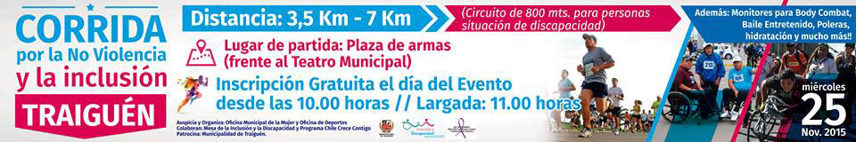 El Alcalde de la Comuna, Luis Alvarez Valenzuela hace extensiva la invitación a todos/as quienes deseen participar en la 1ª Versión de la Corrida Recreativa por la No violencia y la Inclusión, que se realizará en nuestra comuna, hoy miércoles 25 de noviembre a partir de las 11.00 horas.