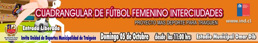 El próximo domingo 5 de octubre del presente a partir de las 11:00 hrs., en el Estadio Municipal de nuestra comuna, se realizará un Cuadrangular de Fútbol Femenino “Copa Municipalidad de Traiguén”En esta actividad participarán los Representativos de: Traiguén, Lumaco, Angol y Collipulli, la programación contempla dos partidos en la jornada de la mañana y la disputa del 3º y 1º Lugar en la tarde desde las 15.00 hrs.