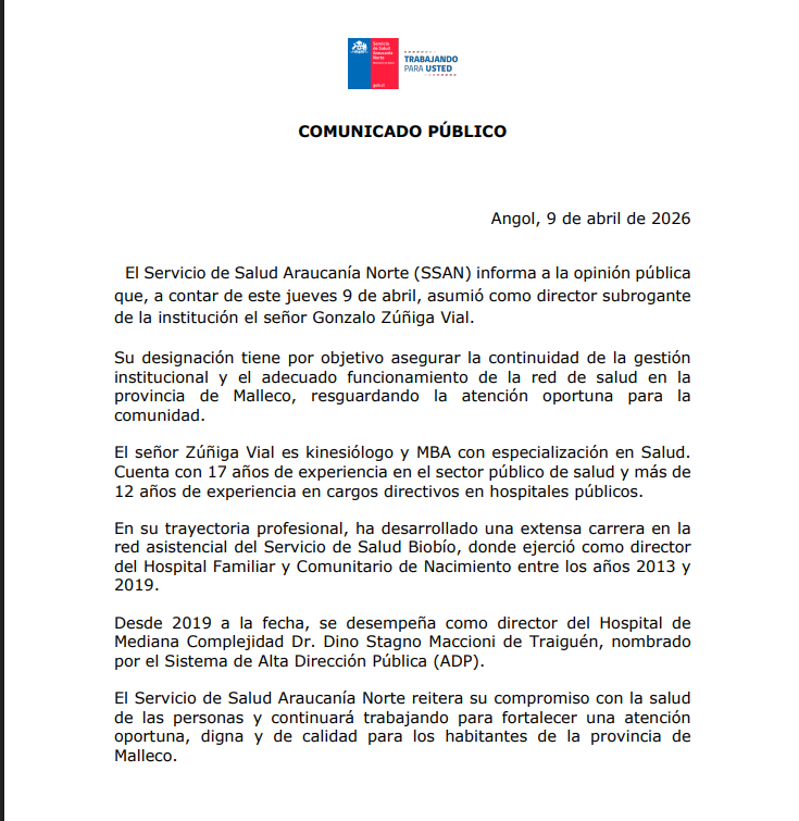 Un importante cambio en la conducción de la red de salud de la provincia de Malleco fue informado mediante un comunicado oficial del Servicio de Salud Araucanía Norte (SSAN), donde se confirmó que, desde el jueves 9 de abril, asumió como director subrogante el profesional Gonzalo Zúñiga Vial.