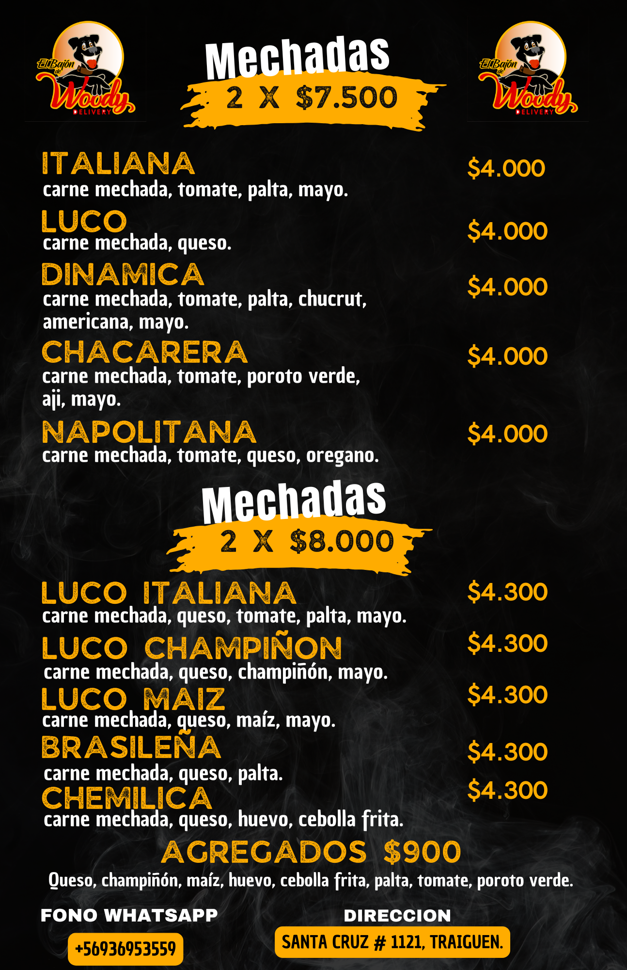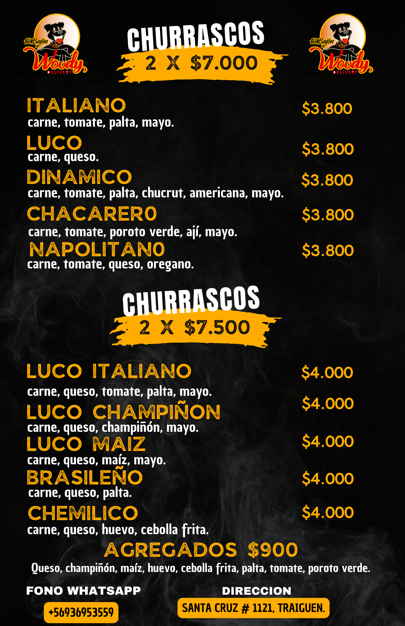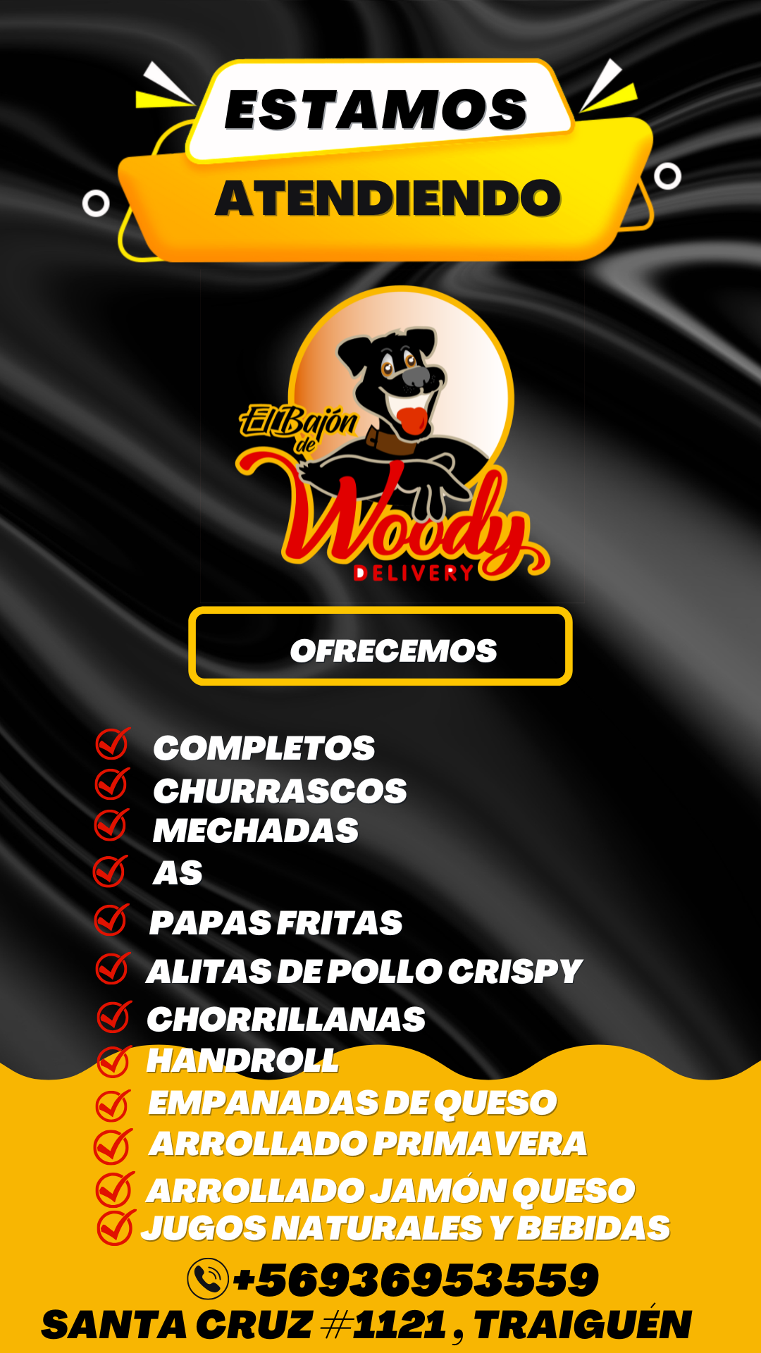 Nos dedicamos a la elaboración de ricos productos como churrascos, completos, mechadas, papas fritas entre otros. Contamos con consumo en nuestro local ubicado en calle santa cruz 1121 Traiguen, realizamos despacho a domicilio de lunes a sábados puedes contactarnos a través de nuestro WhatsApp+56936953559 o a través de las redes sociales como el bajón del woody