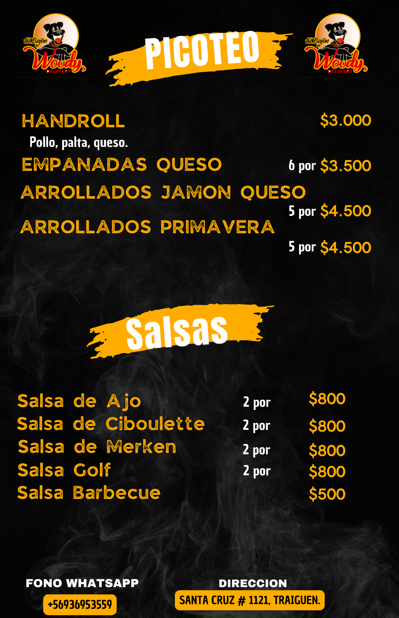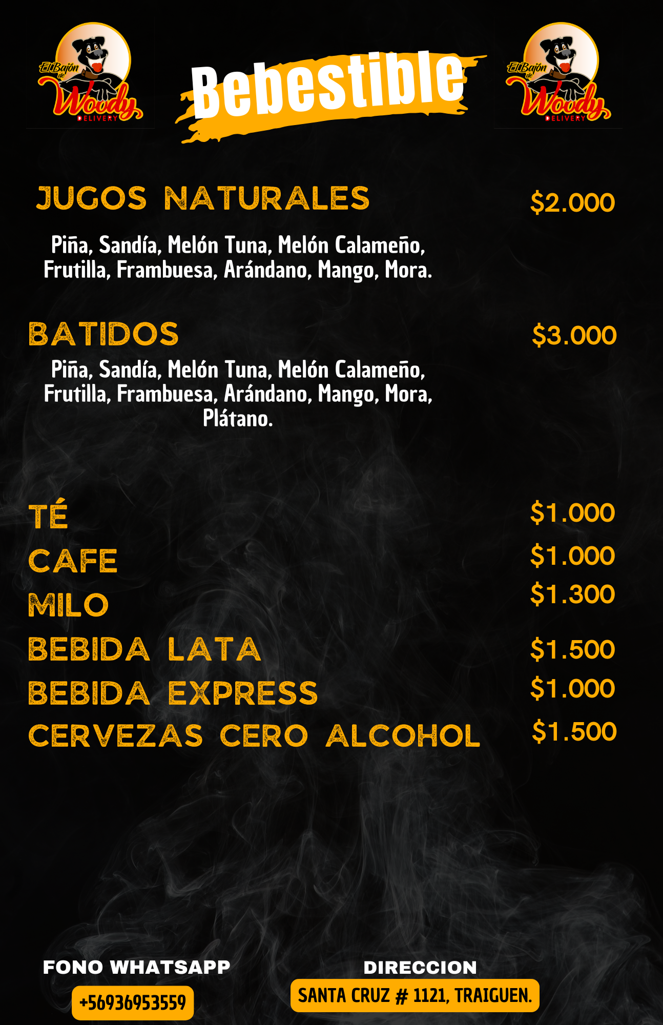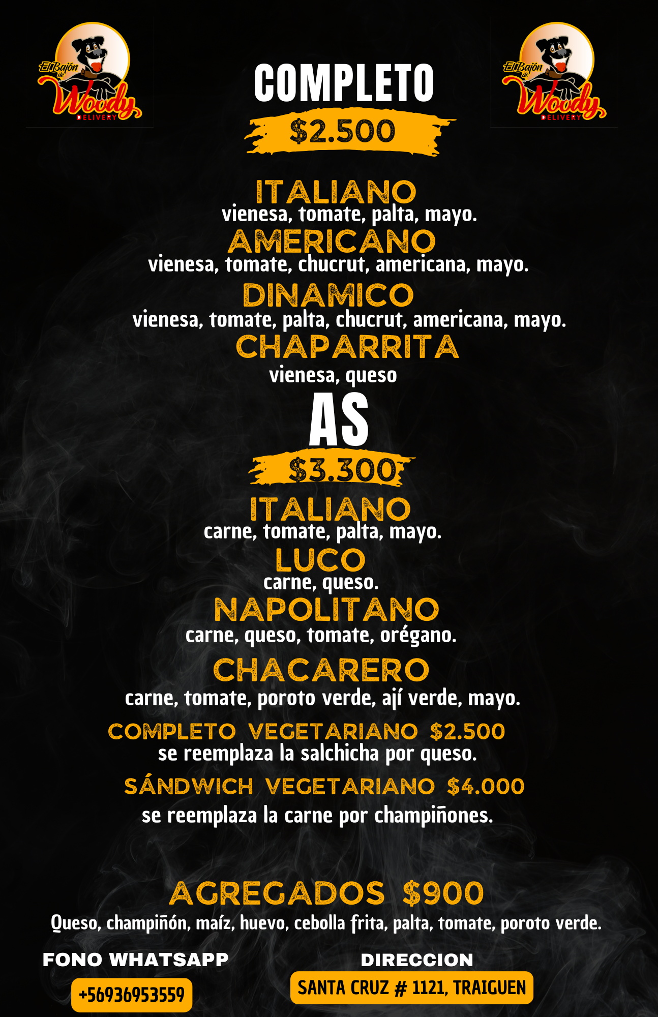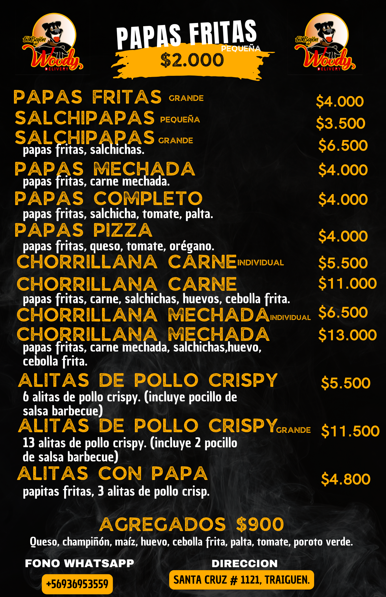 Nos dedicamos a la elaboración de ricos productos como churrascos, completos, mechadas, papas fritas entre otros. Contamos con consumo en nuestro local ubicado en calle santa cruz 1121 Traiguen, realizamos despacho a domicilio de lunes a sábados puedes contactarnos a través de nuestro WhatsApp+56936953559 o a través de las redes sociales como el bajón del woody