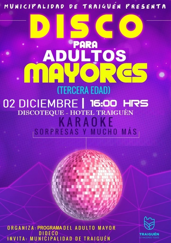 La Ilustre Municipalidad de Traiguén invita a todos los adultos mayores de nuestra comuna, a una «Disco Para Personas Mayores», esto en el marco del Aniversario de 144 de Traiguén.