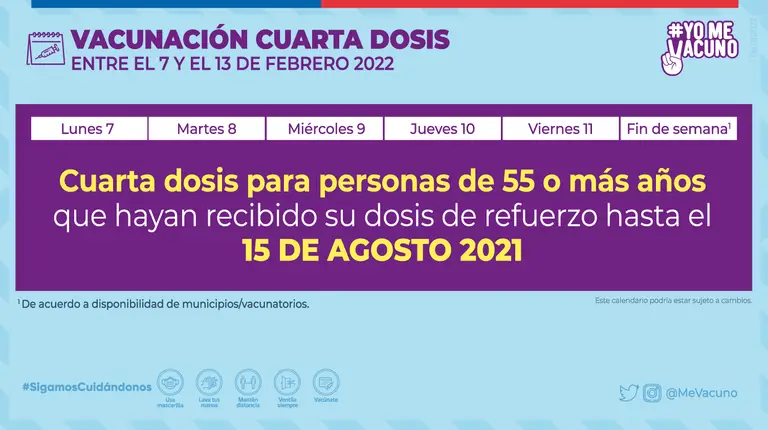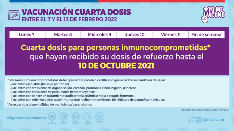 La cuarta dosis, además se estará aplicando también este 5 y 6 de febrero para todos aquellos pacientes inmunocomprometidos que se vacunaron hasta el 3 de octubre de 2021 con la tercera dosis, según la disponibilidad existente en municipios y vacunatorios.