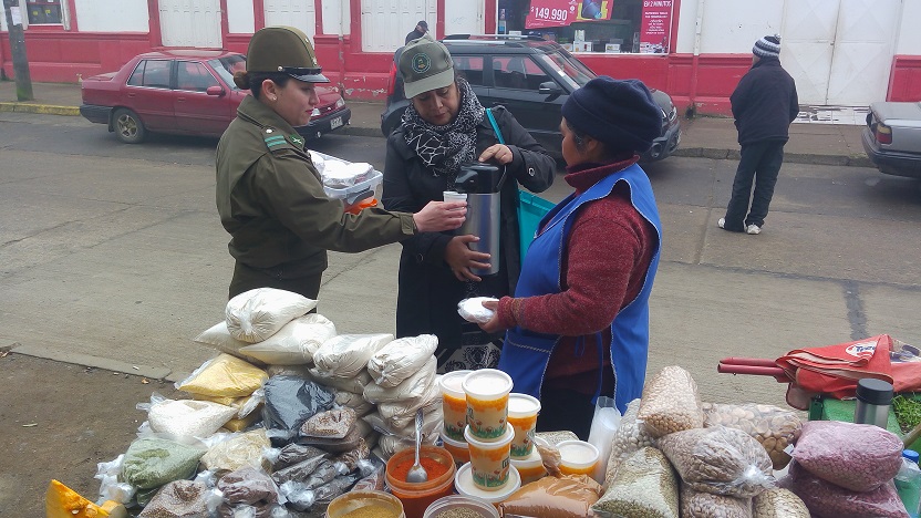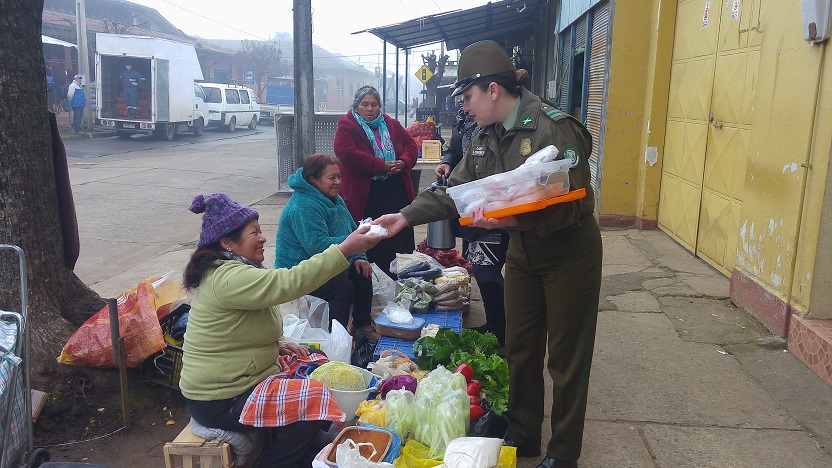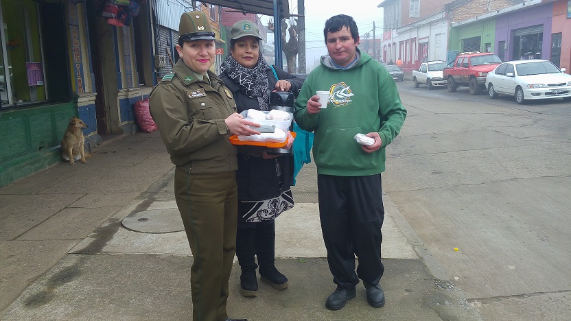 La integrante de la patrulla comunitaria cabo 1º Karen Contreras Flores concurrió al sector céntrico de esta comuna en compañía de la dirigente vecinal de la Junta de vecinos los volcanes de Chile, con la finalidad de capiar las bajas temperaturas repartiendo sándwich y un café reconfortante en estas bajas temperaturas, a feriantes que llegan temprano del campo a la ciudad, a ofrecer sus frescas verduras, como también a trabajadores que ejercen su función en el intemperie los cuales demostraban su alegría y agradecimiento por el actuar.