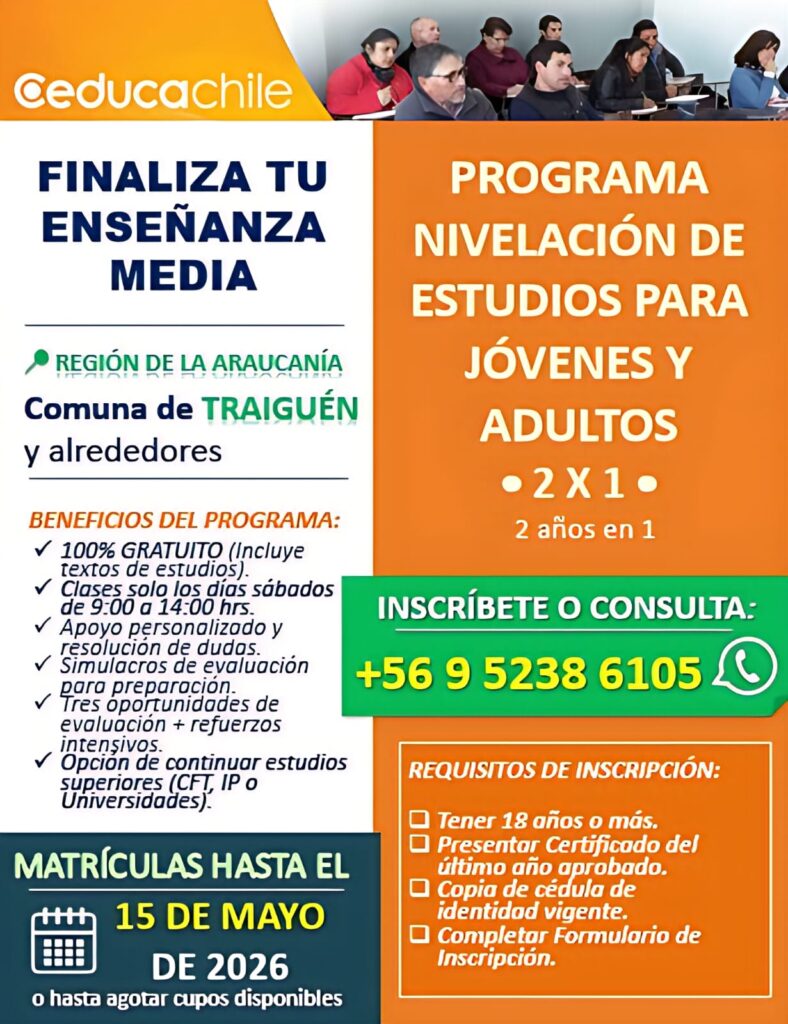 Una importante oportunidad educativa se encuentra disponible para la comunidad de Traiguén y sus alrededores. Se trata del Programa de Nivelación de Estudios para Jóvenes y Adultos, impulsado por Ceduca Chile, que permitirá a quienes no han terminado su enseñanza media, poder completarla de manera accesible y gratuita.