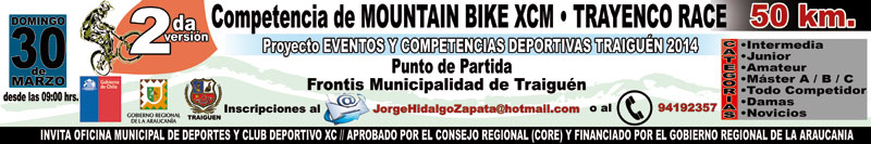 Este domingo 30 de marzo del presente a partir de las 9:00 hrs. se realizará la Segunda Versión de la Competencia de Mountanbike XCM «Trayenco Race», actividad deportiva organizada por la Oficina Municipal de Deportes con la colaboración del Club Deportivo XC, que contempla una ruta urbano rural de 50 Kms. reunirá a los mejores exponentes del MTB de la zona, la inscripción es gratuita. Esta actividad será financiada con recursos del Proyecto «Eventos y Competencias Deportivas Traiguén 2014» financiado por el Gobierno Regional y aprobado por el CORE. Se premiarán a los tres primeros de cada una de las 10 categorías dispuestas por la Organización: INTERMEDIA – JUNIOR – AMATEUR – MASTER A-B-C – TODOCOMPETIDOR – DAMAS – NOVICIOS. Mayor Indormación en Oficina de Deportes fono/2994110 – o al correo jorgehidalgozapata@hotmail.com.