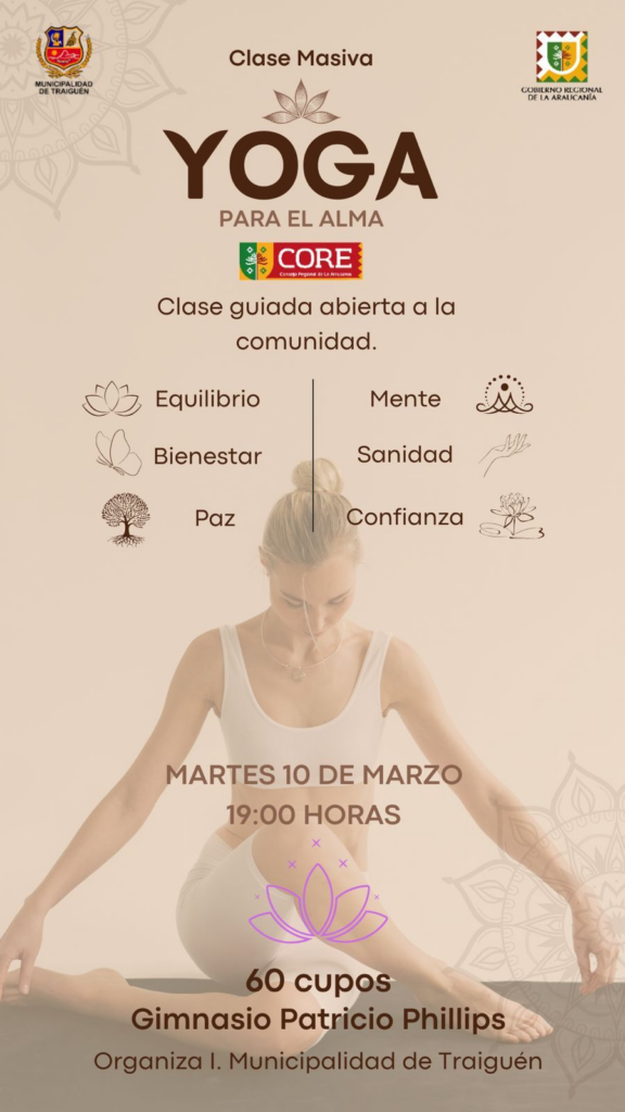 En el marco de las actividades de conmemoración del Mes de la Mujer, la Ilustre Municipalidad de Traiguén ha extendido una invitación especial a todas las vecinas y la comunidad en general para participar en una jornada de conexión y autocuidado denominada «Yoga para el Alma».