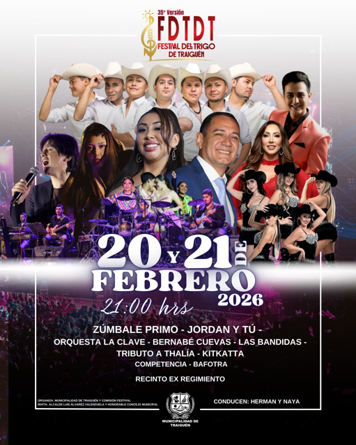 La Municipalidad de Traiguén, invita a toda la comunidad y visitantes a disfrutar de una nueva versión de esta gran fiesta que celebra nuestras tradiciones, música y cultura, viernes 20 y sábado 21 de febrero, en el recinto Ex Regimiento, ambos días desde las 21.00 horas.